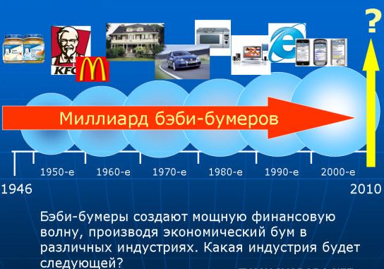 Наглядно бэби-бумеров можно изобразить в виде огромной финансовой волны, которая производит экономический бум в целых индустриях. Как написано в книге «Новые профессионалы» (Чарльз Кинг и Джеймс Робинсон), в руках бэби-бумеров сосредоточена половина всей денежной массы мира. Практически все миллиардеры мира — это бэби-бумеры. В книге «Возрастная волна» доктора Кена Дихтвольда написано: «Если вы знаете, что нужно людям бэби-бума, вы — богатый человек». Читатель, а как Вы думаете, что же бэби-бумерам нужно сейчас, в 2009 году? На что бэби-бумеры будут тратить триллионы долларов в ближайшие 10-15 лет? Хотите заглянуть на несколько лет в будущее, чтобы получить ответ на этот вопрос?